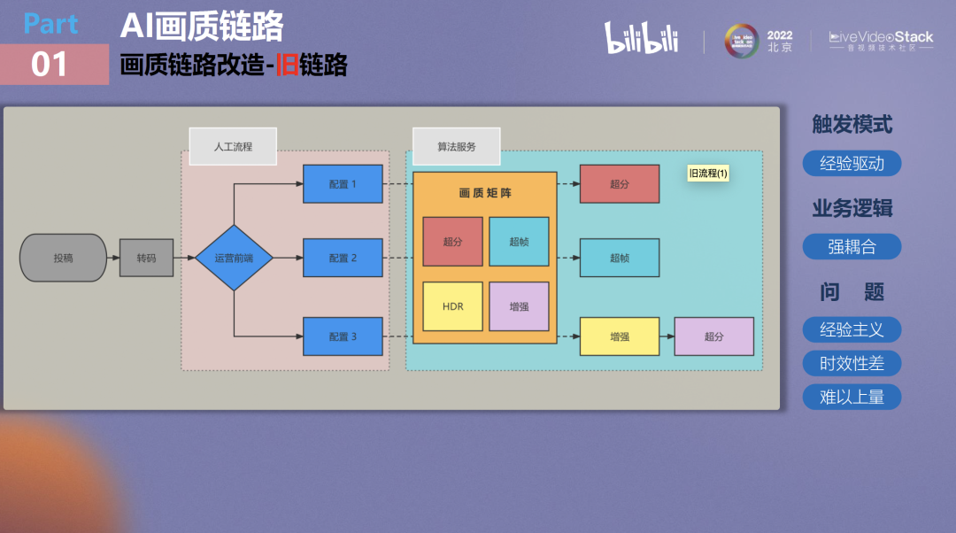 在这里谈谈B站以前旧的画质生产链路,在过往长期的业务需求里我们积累了大量的画质原子能力,形成了画质矩阵,但实际上应用模式并没有实时更新到原子能力的增长上。