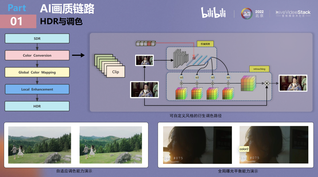 本页讲一下我们所做的HDR工作。HDR也是一项非常重要的工作,因为人眼对色彩是非常敏感的。将SDR转为HDR大概需要三个步骤,第一步是Color Conversion,它是在8bit上对全局的曝光和色彩进行调整,调整后能够得到很好的色彩增强效果。第二步是Global Color Mapping,在这个阶段主要将8bit由bt709色域映射至bt2020色域的10bit HDR。第三步是Local Enhancement,主要是进行一些局部微调,至此HDR的AI生产链路就完成了。