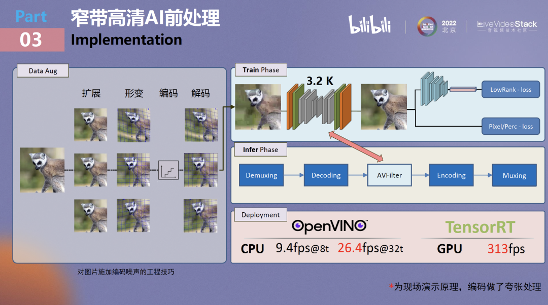 以上述训练策略和方法来训练网络,在实际部署阶段非常简单,它是一个frame by frame的处理,不涉及时域工作,可以无缝插入到所有基本的转码流程中来达到收益。本算法最终只用了三千个参数就达到了低秩学习分解的能力,即使在CPU上也能够得到很好的推理性能,目前基于TensorRT做T4卡的部署可以跑到300fps以上,可以满足大规模生产的需求。