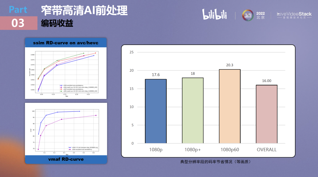 这里介绍一下编码收益,主要分三部分,第一部分是基于ssim的RD-curve,使用ssim做编码的同学都知道,ssim是比较难优化的,我们在264、265甚至在AV1上都达到了一个全局的ssim的编码收益。