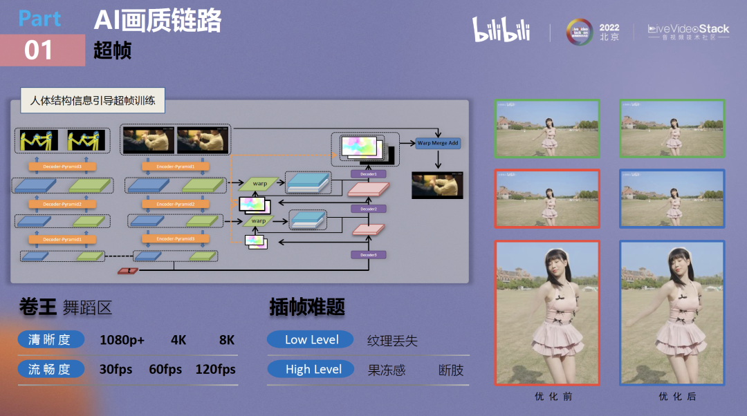 除超分外,我们也支持很多low level的能力,比如超帧。不知道大家对B站舞蹈区是否有了解,舞蹈区可谓是所有分区中的“卷王”,这主要体现在拍摄手段上,舞蹈区UP主们的拍摄手段甚至会比一些摄像、器材区的UP主还要专业,舞蹈区视频普遍已经达到了4K清晰度,有些甚至到了8K。流畅度方面,如果大家观看宅舞较多,应该知道高帧率下人体的舞蹈是非常丝滑的,众宅男对60fps也有相当高的需求。如果观察B站舞蹈区排行榜就会发现,榜单头部视频都至少支持60fps,有的甚至支持120fps。