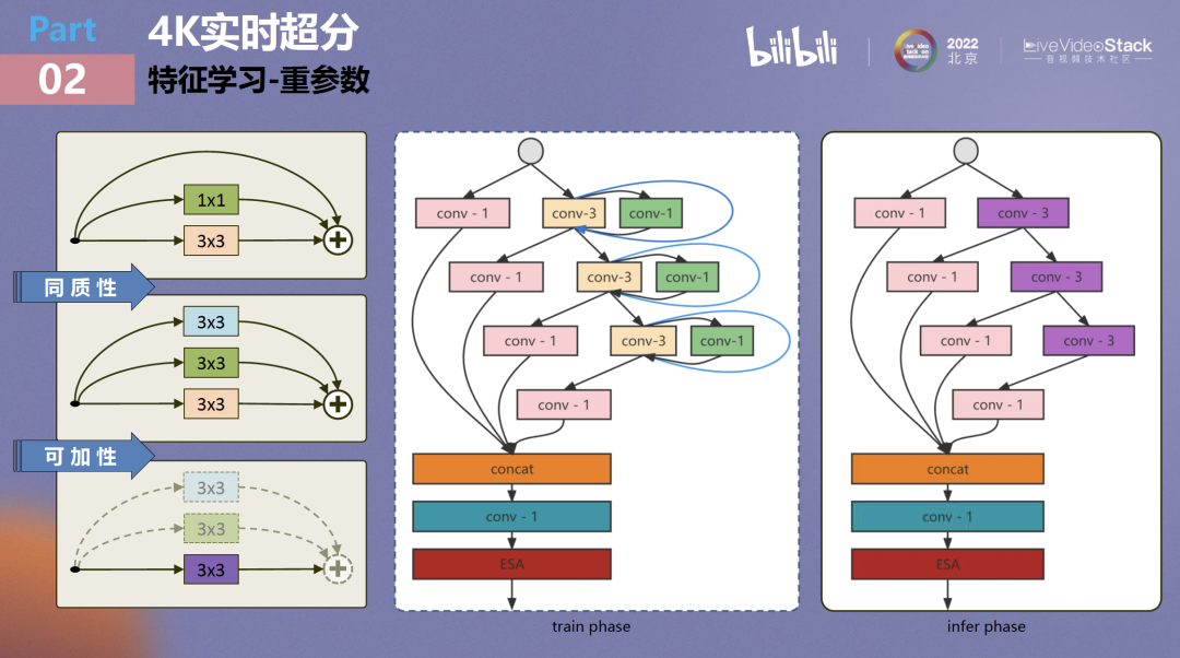 重参数的原理可以归结为,利用卷积的同质性和可加性把不同的卷积进行融合。从上图中可以看到,开始的计算结构有三个链接:一个跳跃链接、一个1×1卷积和一个3×3卷积,通过卷积的两个特性可将它们最终归并成一个3×3卷积。大家可能有疑问,为什么不可以直接使用3×3卷积呢,这是因为三个链接的学习力度是不一样的,跳跃链接、1×1和3×3对特征抽取的力度不同,所以可以使用一个很简单的策略,不增加额外计算量即可提升卷积模块的学习性能。在训练阶段采用重参数,在infer阶段则是把它归并成单个卷积。