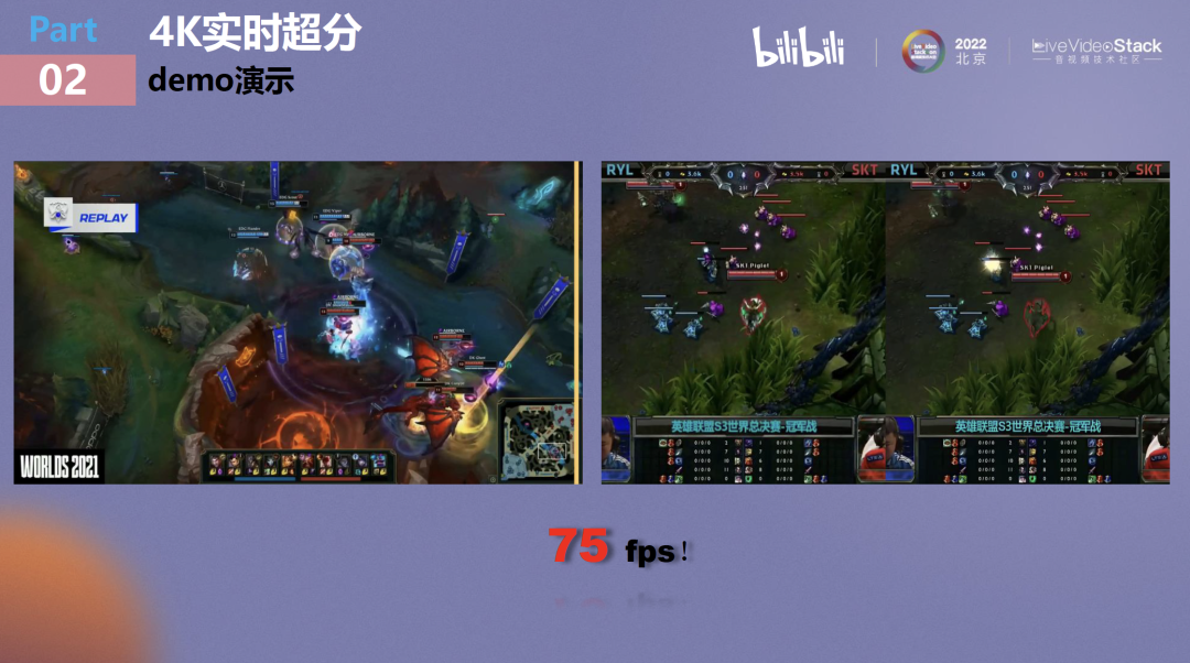我们去年也参与了英雄联盟S12的全程直播,实际上S12这种头部赛事也是不支持4K清晰度的,主办方为了保证所有下游直播方的服务稳定性,主推的流为1080P 60帧。但大多数用户对4K是有天然需求的,我们希望能够一步到位,单卡下支持4K 60帧的超分。这项工作非常难,不仅在于要将1080P实时超帧到4K清晰度,而且还要保持60帧的高帧率。