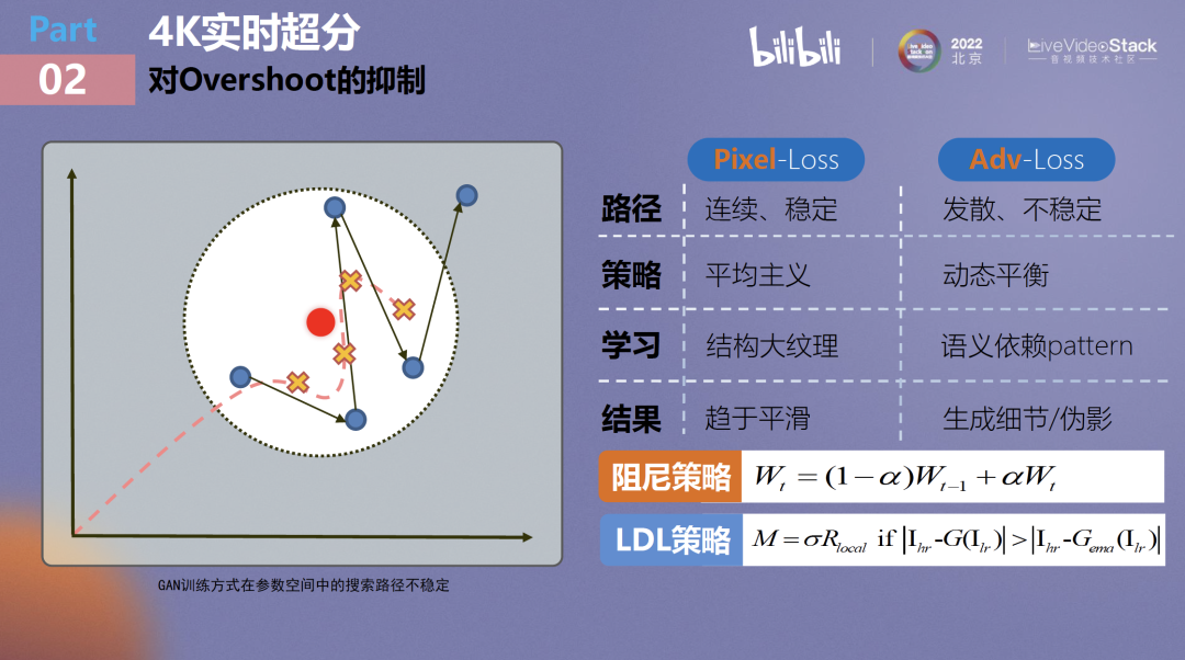 最后一个悬而未决的问题是,我们在训练策略中引入了对抗生成网络的方式,大家也提到这将大概率造成伪影的问题,怎么理解这个问题呢?把特征搜索路径以上图来进行示意,可以看到,如果不对GAN训练增加约束,它的参数搜索将极不稳定。