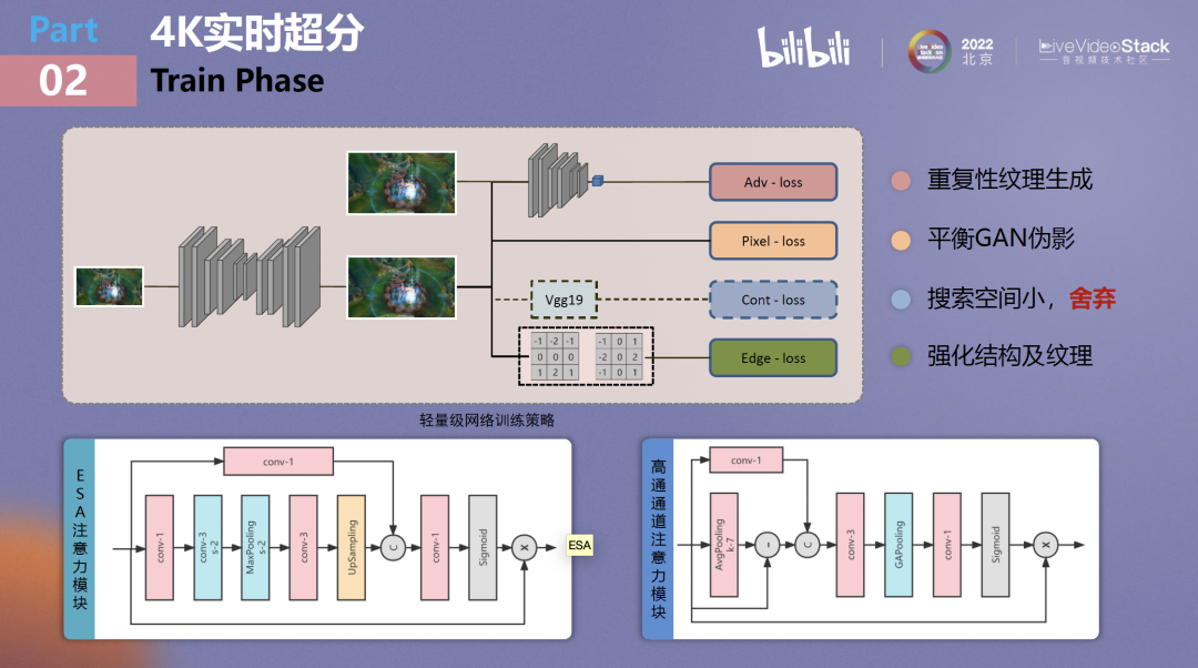直播游戏场景还有另外一个特点,就是接到的原始流其实都经过了编码,这个问题会贯穿点直播业务始终,为了应对源流编码造成的细节损失,我们采用GAN引入对抗loss以达到重复纹理生成的目的,并且配合Pixel-loss初步约束GAN可能产生的伪影。
