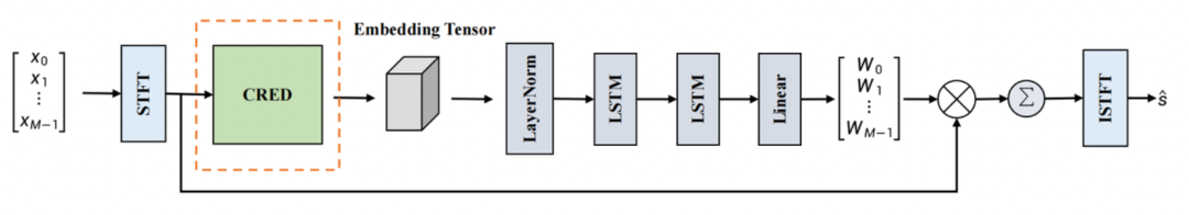 该网络借助嵌入波束网络(Embedding and Beamforming Network,EaBNet)的结构范式,将网络分为嵌入模块和波束模块两个部分,嵌入模块用来提取聚合频谱和空间信息的嵌入向量,并将该嵌入向量送入波束部分导出波束权值。这里采用一个 CRED 结构来学习嵌入张量,多通道输入信号经过 STFT 变换后,送入一个 CRED 结构提取嵌入张量,该嵌入张量类似传统波束形成中的空间协方差矩阵,包含可区分语音和噪声的特征。嵌入张量经过 LayerNorm2d 结构,再经过两层堆叠的 LSTM 网络,最后通过一个线性层导出波束权值。我们对该波束权值作用于多通道输入频谱特征上,进行滤波求和操作,最后得到纯净语音谱,经过 ISTFT 变换即可得到目标时域波形。