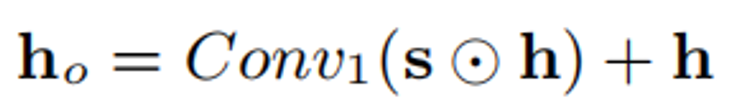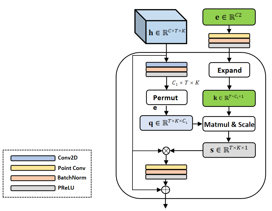 说话人注意力模块(Speaker Attentive Module)的结构如上图。其核心思想是使用说话人嵌入向量 e 作为语音增强模型中间特征的吸引子,计算其和中间特征所有时间和频带上的相关度 s,称作注意力值。该注意力值将被用于对中间特征 h 进行缩放规整。其具体公式如下: