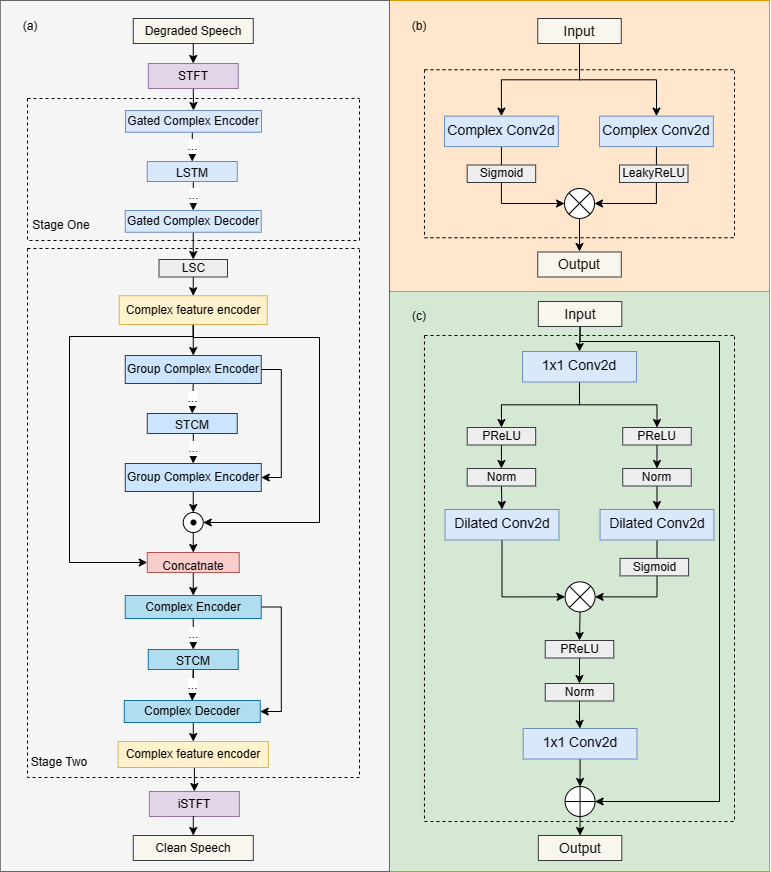 下图为两阶段模型整体框架构图,其中,第一阶段模型主要修复频谱缺失的部分,第二阶段模型则主要抑制噪声、混响以及第一阶段模型可能产生的伪影。