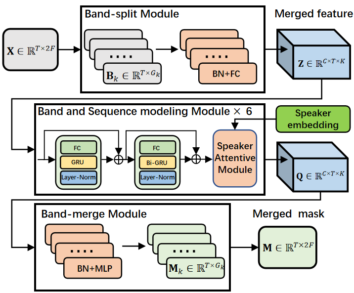 实时特定说话人语音增强任务有许多问题亟待解决。首先,采集声音的全频带宽度提高了模型的处理难度。其次,相比非实时场景,实时场景下的模型更难定位目标说话人,如何提高说话人嵌入向量和语音增强模型的信息交互是实时处理的难点。受到人类听觉注意力的启发,火山引擎提出了一种引入说话人信息的说话人注意力模块(Speaker Attentive Module,SAM),并将其和单通道语音增强模型-频带分割循环神经网络(Band-split Recurrent Neural Network,BSRNN) 融合,构建特定人语音增强系统来作为回声消除模型的后处理模块,并对两个模型的级联进行优化。