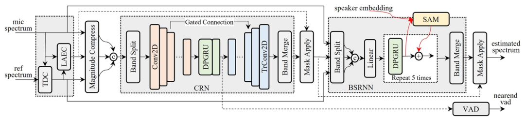 回声消除一直是外放场景中一个极其复杂且至关重要的问题。为了能够提取出高质量的近端干净语音信号,火山引擎提出了一种结合信号处理与深度学习技术的轻量化回声消除系统。在特定说话人降噪(Personalized Deep Noise Suppression, pDNS ) 基础上,我们进一步构建了特定说话人回声消除(Personalized Acoustic Echo Cancellation, pAEC)系统,其包括一个基于数字信号处理的前处理模块、一个基于深度神经网络的两阶段模型和一个基于 BSRNN 和 SAM 的特定说话人语音提取模块。