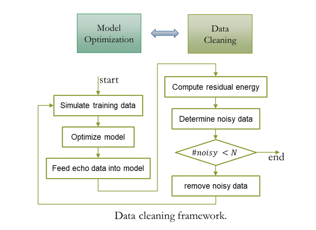 为了使回声消除系统可以处理多设备,多混响,多噪音采集场景的回声,我们通过混合回声和干净语音,得到 2000+ 小时的训练数据,其中,回声数据使用 AEC Challenge 2023 远端单讲数据,干净语音来自 DNS Challenge 2023 和 LibriSpeech,用于模拟近端混响的 RIR 集合来自 DNS Challenge。由于 AEC Challenge 2023 远端单讲数据中的回声存在少量噪声数据,直接用这些数据作为回声容易导致近端语音失真,为了缓解这个问题,我们采用了一种简单但有效的数据清理策略,使用预训练的一个 AEC 模型处理远端单讲数据,将具有较高残余能量的数据识别为噪声数据,并反复迭代下图清洗流程。