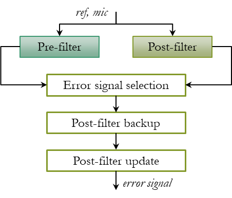 LAEC 是一种基于 NLMS 的子带自适应滤波方法,由两个滤波器组成:前置滤波器(Pre-filter)和后置滤波器(Post-filter),后置滤波器使用动态步长进行自适应更新参数,前置滤波器是状态稳定的后置滤波器的备份。通过比较前置滤波器和后置滤波器的输出的残余能量,最终选择误差信号。