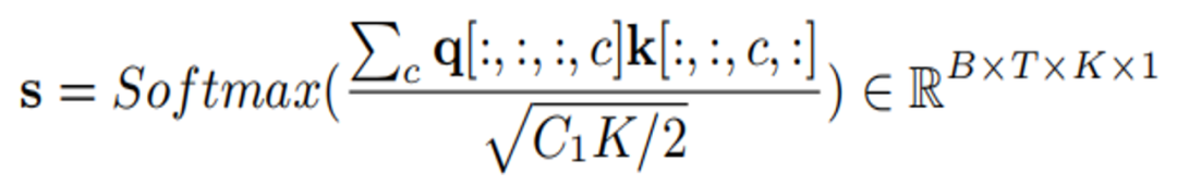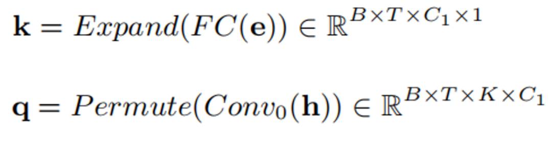 首先通过全连接和卷积将 e 和 h 变换为 k 和 q: