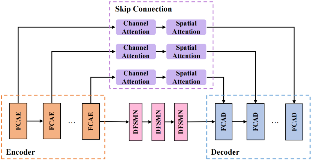 我们采用的 CRED 结构如上图所示。其中,FCAE 为傅里叶卷积注意力编码器,FCAD 为与 FCAE 对称的解码器;循环模块采用深度前馈顺序记忆网络(Deep Feedward Sequential Memory Network,DFSMN)对序列的时序依赖进行建模,在不影响模型性能的基础上减小模型尺寸;跳连接部分采用串联的通道注意力(Channel Attention)和空间注意力(Spatial Attention)模块,用来进一步提取跨通道间的空间信息,并连接深层特征与浅层特征,方便信息在网路中的传输。