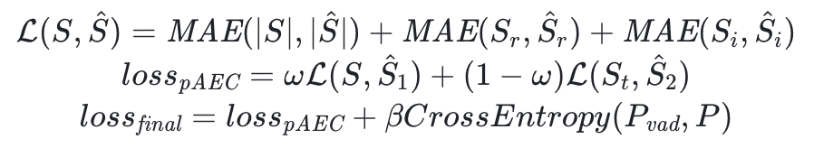 其中, 分别对应模型第一阶段和第二阶段预测的 STFT 特征, 分别表示近端语音和近端特定说话人语音的 STFT 特征, 分别表示模型预测和目标 VAD 状态。