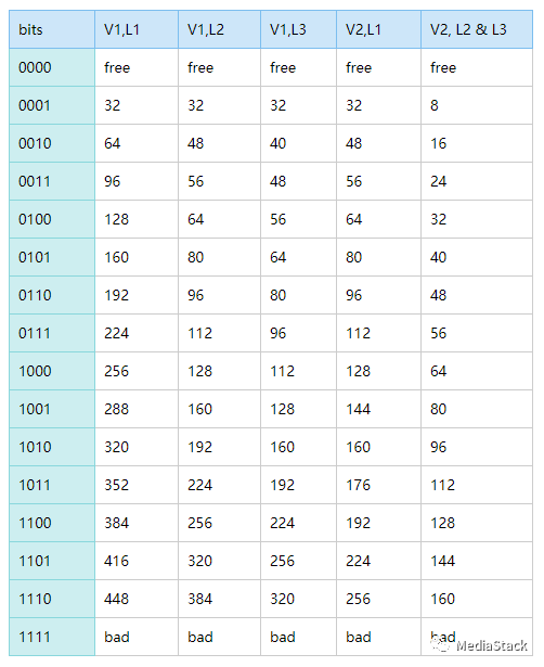 零值表示“自由格式”条件,其中可以使用不需要在列表中的固定比特率。固定意味着一个帧包含 N 个或 N+1 个时隙,这取决于填充位的值。比特率索引是表的索引,对于不同的层是不同的。