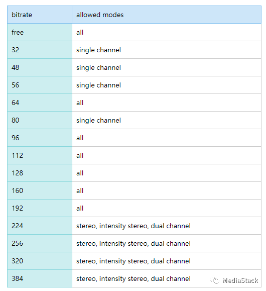 对于 Layer II,有一些比特率和模式的组合是不允许的。这是允许的组合列表。