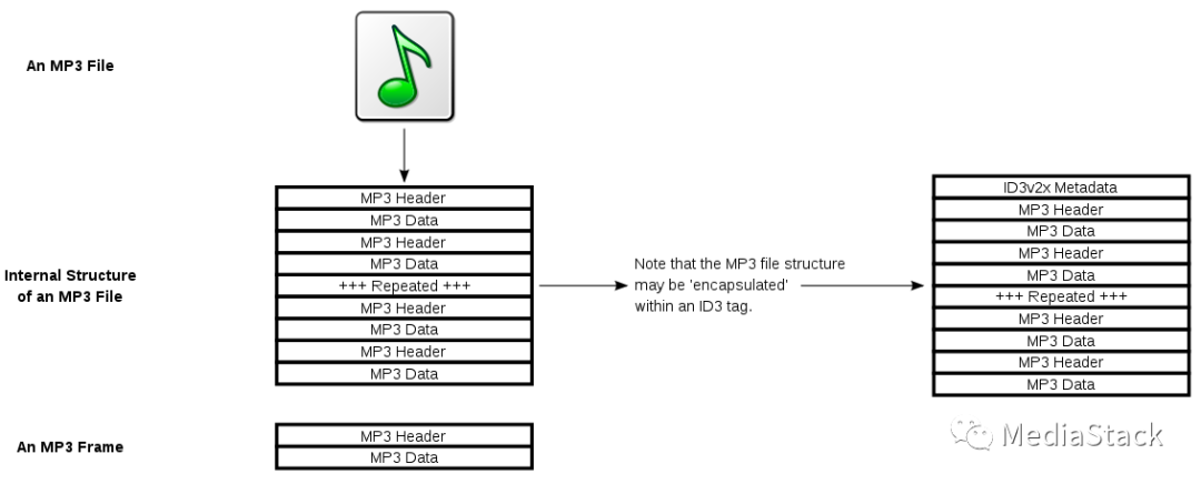 MP3 文件格式是一种包含音频数据和元数据的容器格式。音频数据以 MPEG-1 Layer III 音频帧的形式存储,元数据存储在 ID3 标签中。