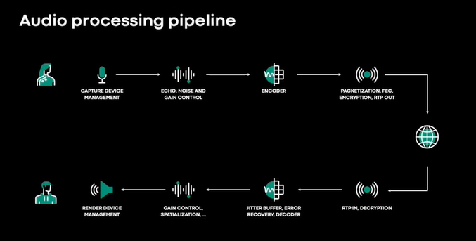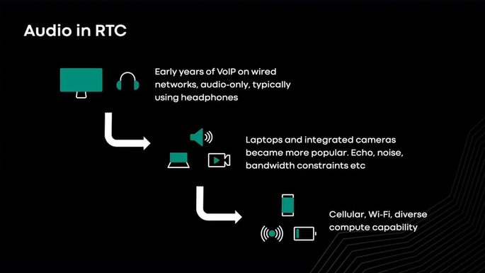 音频工作已经被研究了几十年,为什么这个问题仍是一个挑战呢?这是由于麦克风和扬声器的特性、他们之间的耦合、房间的混响、背景噪音、嘴和麦克风之间的距离,他们都有很大的不同,这与在单个设备上构建音频管道非常不同,我们必须迎合各种各样的设备。为了在我们的规模上提供良好的体验,我们的解决方案及其质量需要从低 CPU.低速率连接和一端的设备扩展,在频谱上最现代的 5G 手机在另一端。我们需要这样做以便我们可以根据用户的特定设备和网络为他们提供良好的体验。更重要的是,用户对音频的容忍度非常低,由于网络的影响或干扰,即使是轻微的断电或噪音也有能非常让人讨厌。