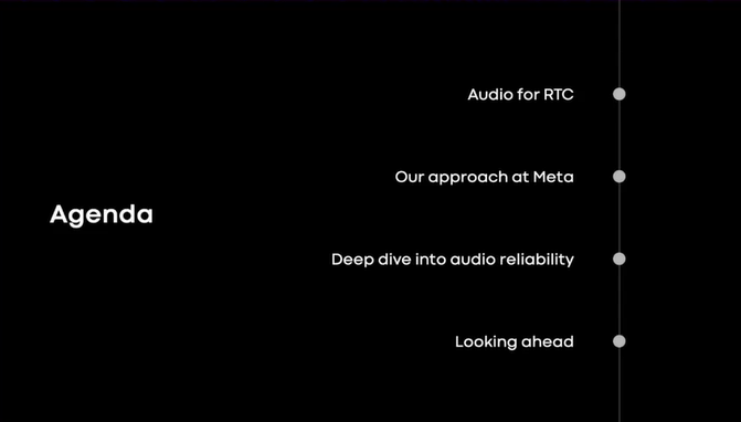 接下来将介绍在元尺度上处理最困难的音频挑战方法,并深入探讨音频的可靠性,确保音频实际工作。最后我将展望未来和 RTC 中最令人兴奋的领域之一,即元宇宙中的大型群组通话。