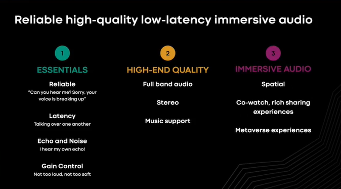 在开始大型沉浸式通话之前,首先要保证得到了正确的基本要素。通话中过长的延时会降低交互性,导致参与者频繁地重复确认通话内容,这不是自然的对话。许多呼叫通过低带宽连接进行,即使最好的 WiFi 网络也会出现拥塞,因此 robust packet loss(指数据通信中对丢包(packet loss)具有鲁棒性或健壮性的特性或算法)也是很重要的一个因素。为避免背景噪音和自己的声音回响,需要全双工、高品质的声学生态消除和非平稳的噪音抑制。全波段立体音频的提供使我们离实现高质量体验的目标更近一步。这一目标的下一步是实现身临其境的音频体验,如特殊音频,这是创造身临其境魔力的关键。