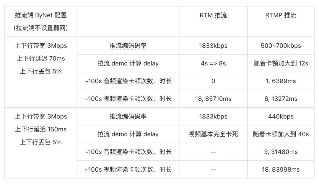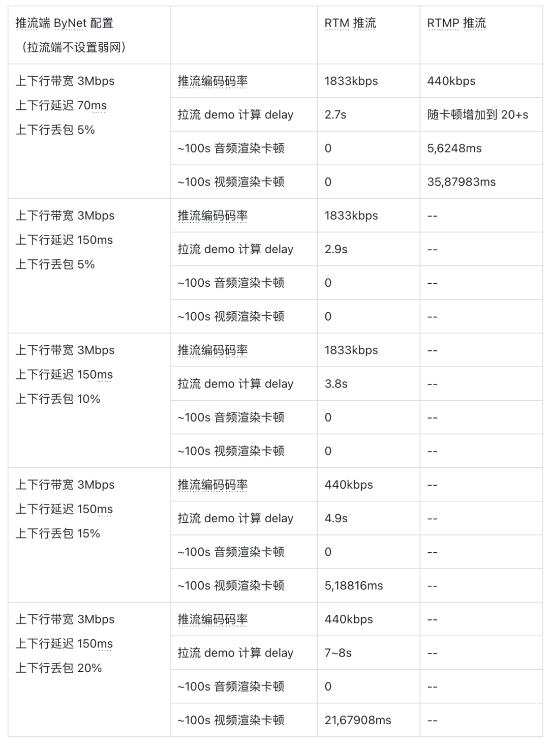 5% 丢包 150ms rtt 的情况,RTM 推流就已经卡得无法播放了(表格中的 — 表示基本无法播放,数据无法统计)。