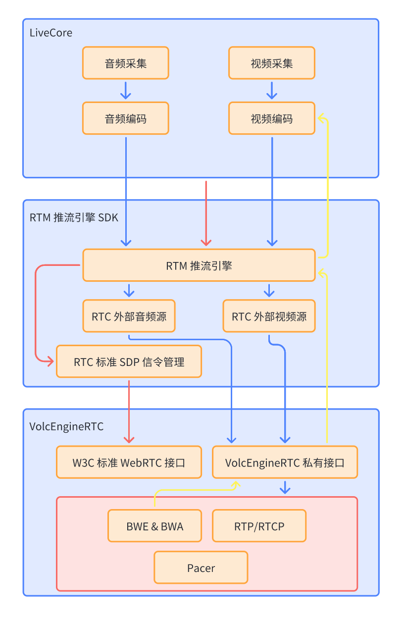 在推流客户端,RTM 推流网络传输层使用了火山引擎自研 RTC SDK(VolcEngineRTC),在设计之初,为了支持业务无缝接入,以及最大化复用已有能力、避免重复造轮子,RTM 推流在客户端采用了 LiveCore(火山引擎自研直播推流 SDK)编码音视频 + VolcEngineRTC 传输的技术架构,如下图所示: