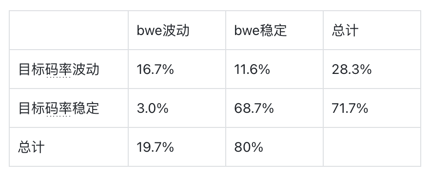 bwe 波动较普遍(19.7%),且 bwe 波动几乎都会引起目标码率波动