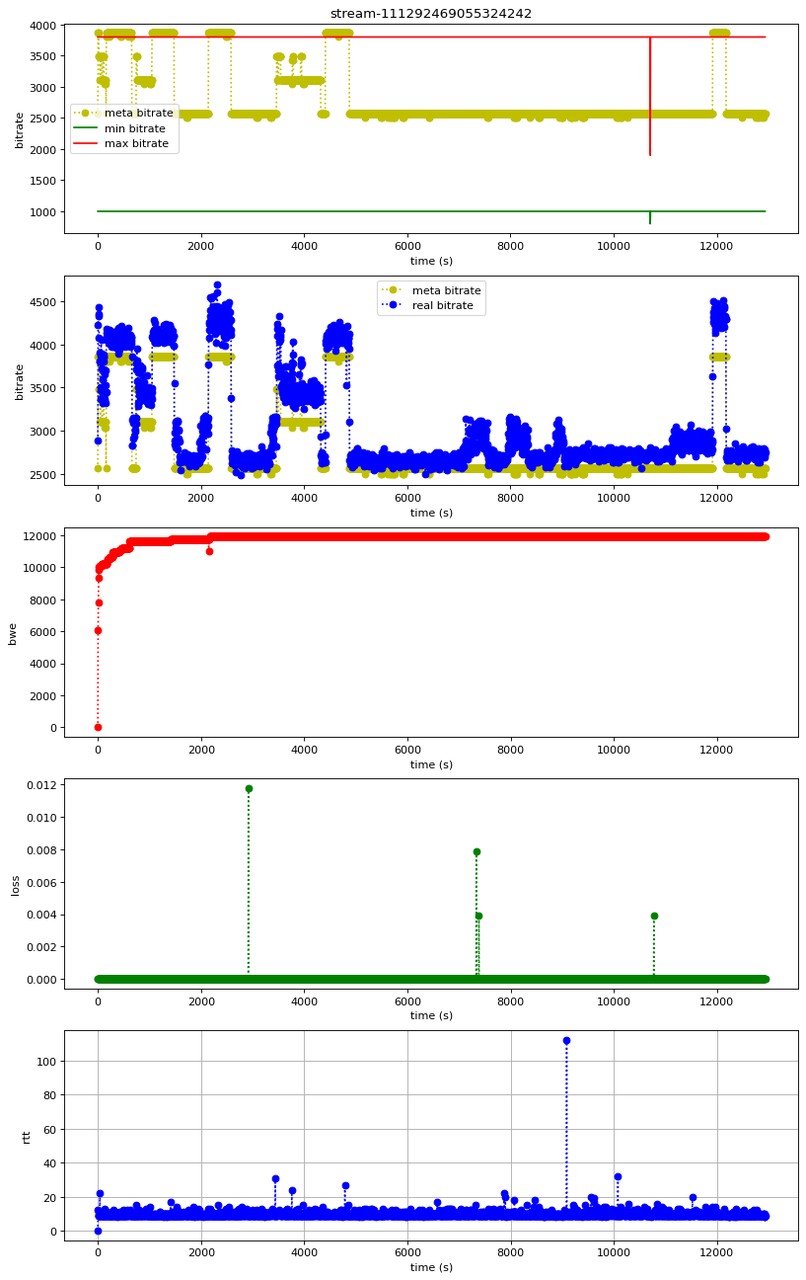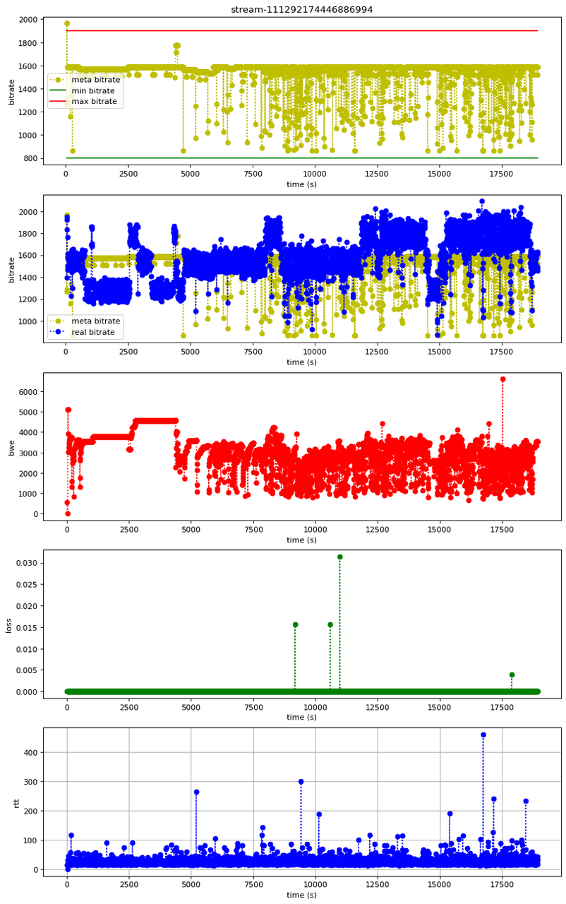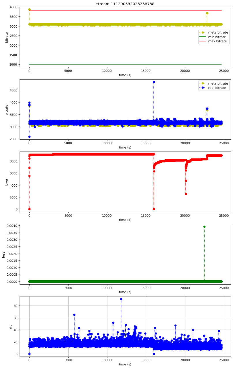 红色线 bwe 震荡波动,大概率会导致黄色线目标码率震荡波动;bwe 的波动不是因为高丢包率,rtt 也是在绝对值较小(100ms 以内)范围内波动。
