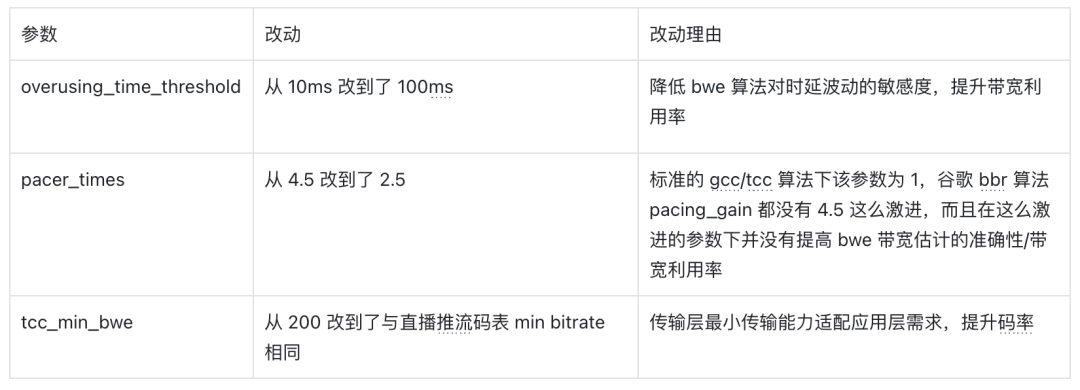 我们梳理了 VolcEngineRTC 代码逻辑以及 bwe 算法参数。好处是可以很方便的通过线上配置直接修改做实验,但是缺点是参数太多、调参太耗费精力且很大可能是收益非常有限(理论上参数的默认值应该就是一个推荐的最优值了),最终我们决定先凭借经验挑选了几个关键参数作为一期方案优化,离线验证调参的收益后就开展一期方案线上 AB 实验,期间也为我们留下了相对充足的时间去做后期优化。
