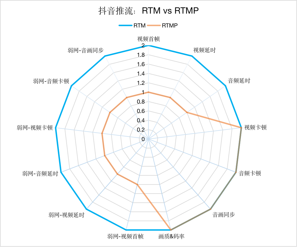 最后我们请视频云团队的音视频实验室对 RTM 推流和 RTMP 推流在抖音上进行了权威的测评,测评结果为: