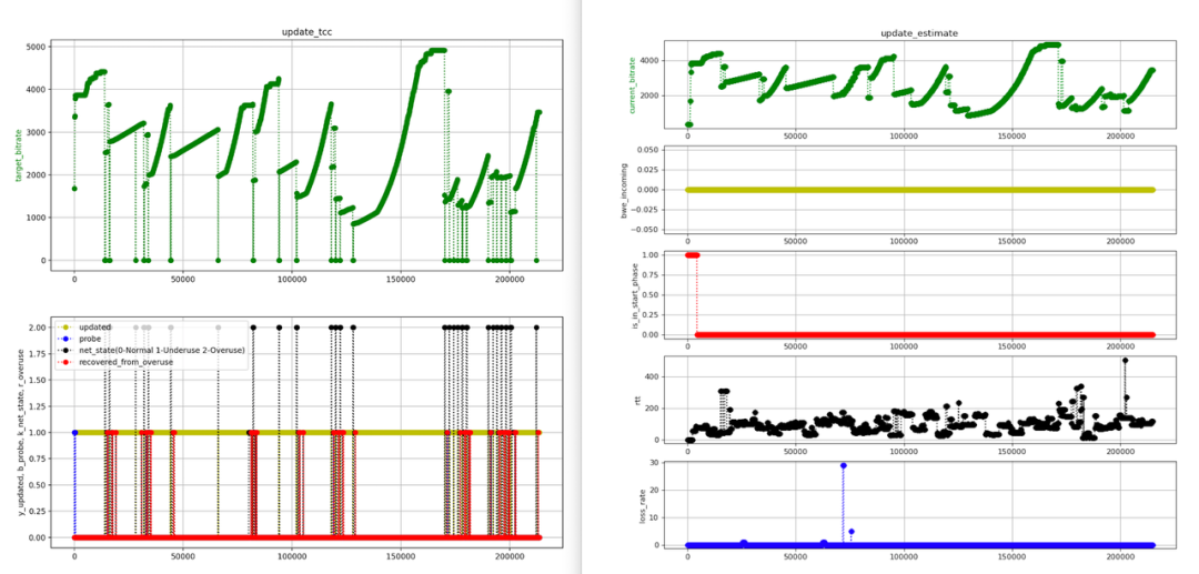 其次,进行问题根因定位。bwe 波动的根因在于算法频繁置位 overuse (左图)来降低所估计的带宽,而 overuse 的判别逻辑在 delay_based_bwe 部分,trendline estimator(基于趋势线的时延估计器)这里把时延抖动误判成了弱网(注:误判是指实际的rtt和丢包情况均不表现为弱网特征,如右图的子图4和子5)。