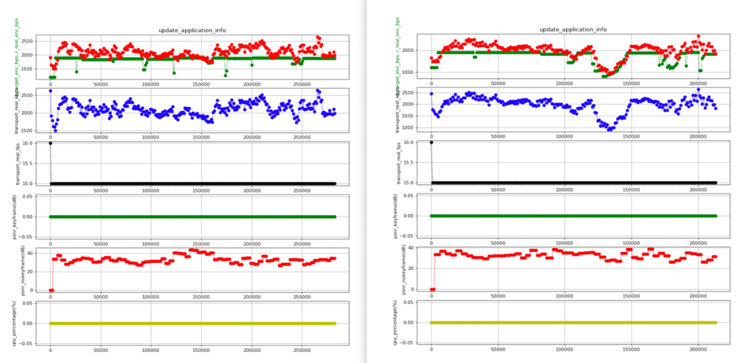 首先是复现问题场景,这里举例2个场景来说明。4Mbps 带宽+时延波动场景(左图)的实验表现和前面线上埋点(5 秒级别)的波动现象吻合,当bwe波动在码表范围内,该测试场景复现了线上 bwe 波动的问题场景;带宽泊松波动场景(右图)周期性波动问题复现更加明显。
