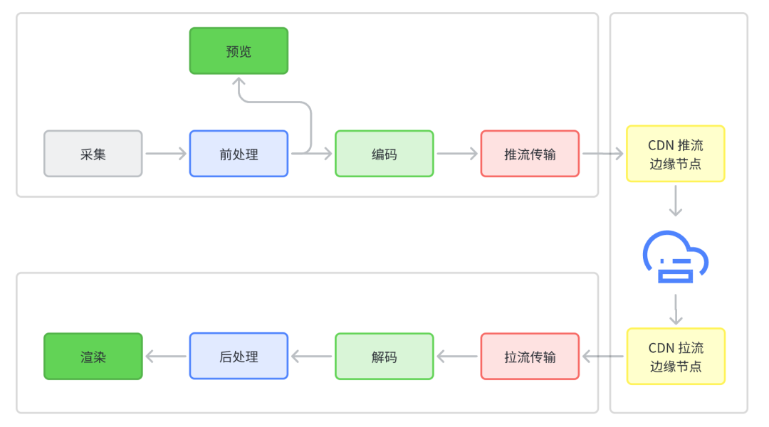 花屏的可能原因很多,从主播端到观众端的整个链路中,任何一个环节都可能出错导致花屏,下面是典型的视频全链路涉及到的环节: