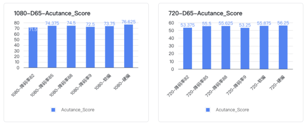 VMAF : 硬编切软编后,指标下降较明显,软编各个降码率点之间指标下降不明显 Acutance(图卡清晰度指标):硬编切软编后,指标下降较明显,软编各个降码率点之间指标下降不明显