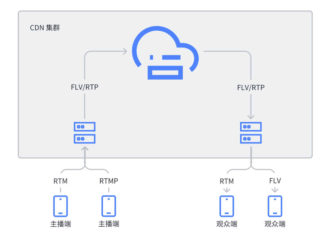 目前 CDN 厂商对 RTM 的支持主要有两种技术架构,一种是基于传统的 RTMP/FLV 架构,在推拉流边缘节点增加 RTM 接入协议的支持,CDN 集群内部复用传统架构,另一种是 CDN 内部集群也采用 RTP/RTCP 协议和架构。CDN 的技术架构如下图所示: