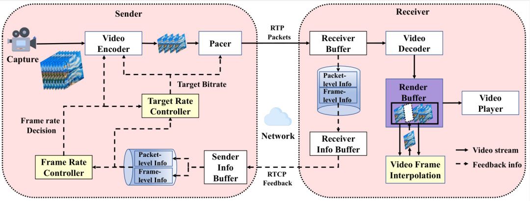 在 FRC 和 TRC 的帮助下,发送端的编码和发送策略可以根据最近 时间段内的反馈周期性地改变。在接收端部署与渲染器耦合的 VFI 模块,以减轻帧率降低和降低丢帧率。