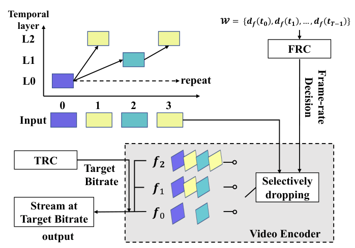 为了在传输过程中提供更多的灵活性,时域可分层特性在 RTC 系统中得到了广泛的支持。利用分层时序结构,通过选择性地丢弃一个或多个时序增强层,就可以实现在可变的帧率水平上对帧序列进行编码。如图 2 所示,本文采用了一种常见的三层时间结构{L0,L1,L2}。在这种情况下,选择三个合理的帧率级别 {f0,f1,f2}。 表示丢弃 L2 层, f1表示只丢弃 L2 中以 L1 为参考的帧,而 f2 表示完整的 3 层结构。