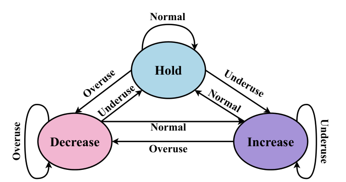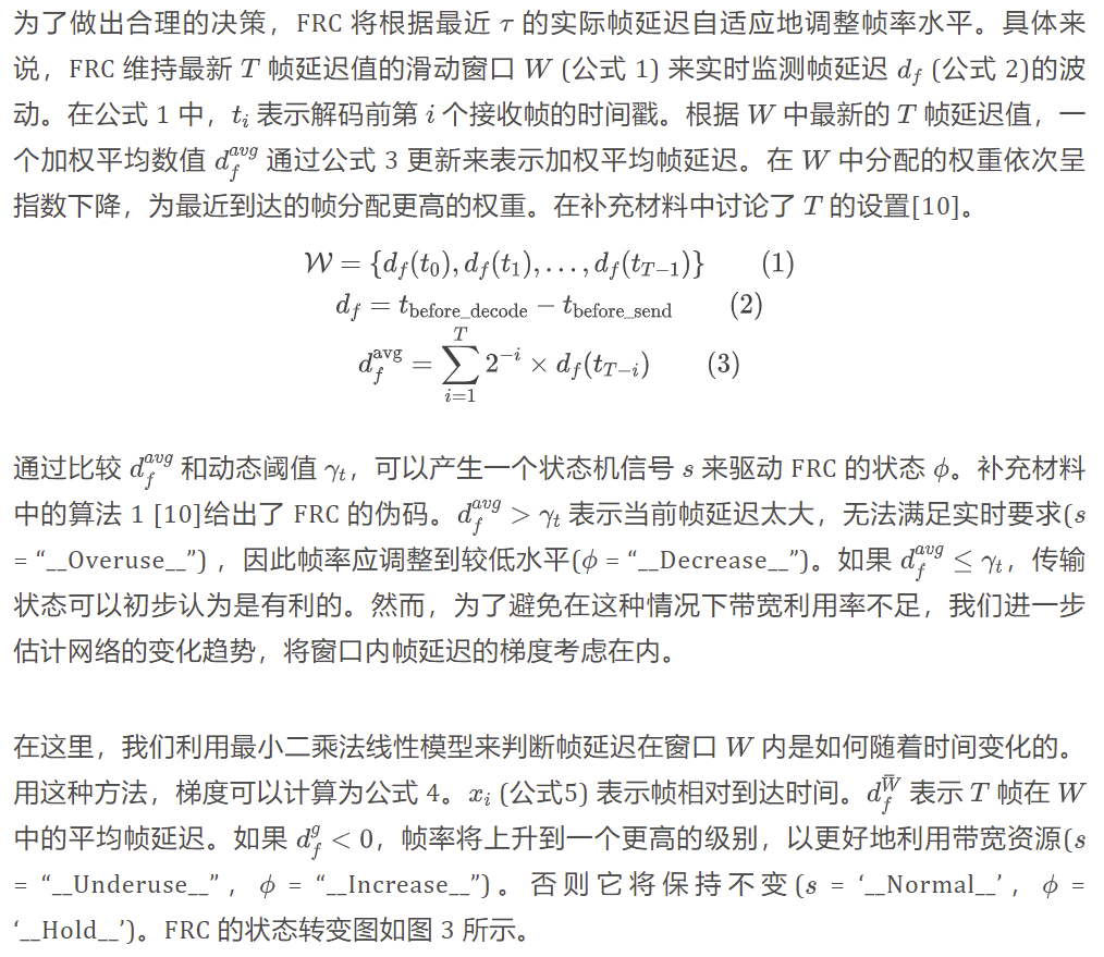 基于 RTC 系统内部的时域可分层性,FRC 被设计成一个有限状态机,通过该状态机,就可以在每个时间间隔内在支持的帧率级别之间动态切换发送帧率。