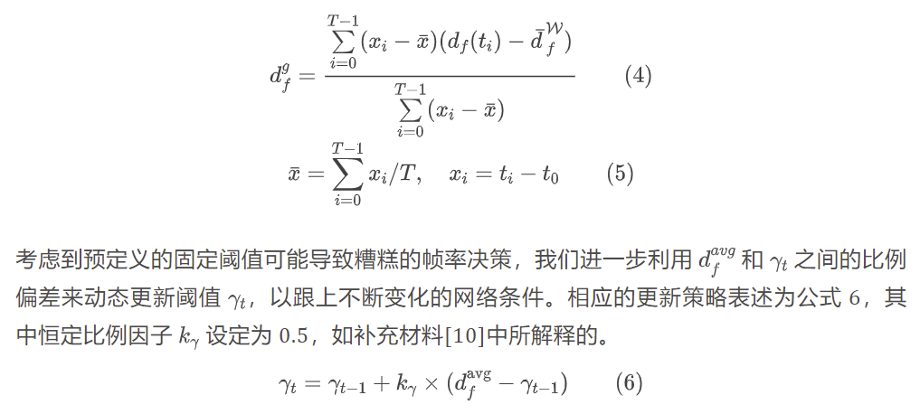 在接收端,在接收到 RTP 流后,接收端缓冲区将其交给视频解码器,同时收集相应的包级和帧级信息。所有这些信息都将存储在接收者信息缓冲区中,并在每个时间间隔 τ (τ = 500ms,与[1]中的默认设置相同)反馈给发送者,以协助 FRC 和 TRC 进行帧速率调整和带宽预测。