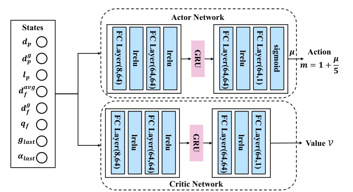 TRC 是基于最近策略优化(PPO)算法[11]建立的,其网络结构如图 5 所示。Actor 网络每 τ 产生动作 m,而 Critic 网络需要估计当前状态的值函数 V,指导 Actor 网络的更新。下面将详细讨论其状态空间、行为空间和奖励函数设计。