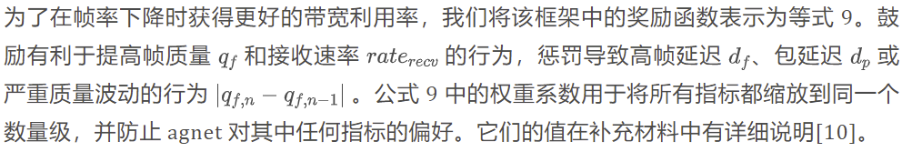 如前所述,使用保守的基于 GCC 的带宽预测算法,由 FRC 带来的帧率降低可能导致带宽使用不足。因此,agent 行为被定义为选择范围从 1 到 1.2 的校准因子 m (如[10]所述) ,使得当帧率水平降低时,GCC 预测的带宽可以立即增加。