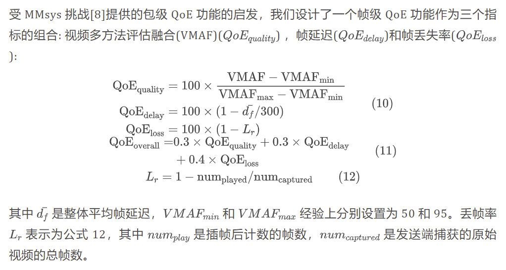 流媒体直播服务近年来发展迅猛,随之而来的是实时通信(RTC)技术和协议的出现。QoE 是系统评估的一个综合性关键指标,它与 RTC 系统的帧延迟、丢帧率和帧质量密切相关。为了保障低延迟性能,当网络中发生拥塞时,RTC 系统往往会在传输过程中丢失一些帧。然而,这种草率的帧丢失策略可能导致丢帧率突然增加、明显的视频不连续性和不可接受的 QoE 降低。此外,[14]在解码器队列中自适应地丢弃帧,以减少 RTC 系统中的队列延迟,代价是丢帧率的增大和带宽浪费。