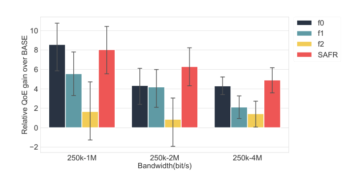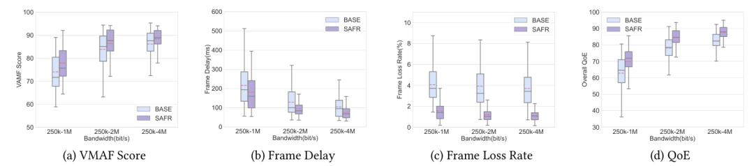 我们将 SAFR 的 QoE 性能与基线(‘BASE’)进行比较,基线是 AlphaRTC [2]和基于 GCC 带宽预测算法的组合。与 BASE 相比,SAFR 不仅增加了三个关键模块(FRC、 TRC、 VFI) ,而且还为帧级信息建立了反馈管道。如图 6 所示,我们的方法优于基线,平均 VMAF 改善 2.28%-3.85%,平均丢帧率降低 61.8%-69.9% ,平均帧延迟降低 16.3% -26.7%。