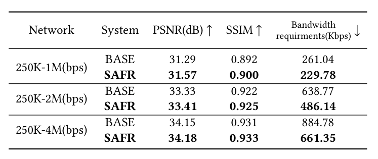 在所有指标方面,SAFR 的四分位间距均远低于基准,这证实了 SAFR 的稳健性。特别是,在较差的网络条件下,SAFR 可以发挥更大的优势。如表 1 所示,SAFR 的表现优于基准测试,在峰值信噪比(PSNR)、 SSIM 失真度指标略有提升,以及在带宽节省方面有着显著提升(12.0% -25.3%),这进一步证实了 SAFR 的优越性。