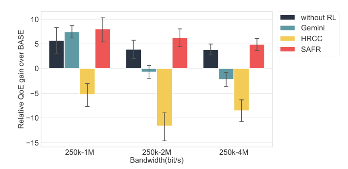 TRC 模块的有效性:为了研究 TRC 的有效性,我们设计了三个替代框架,将 SAFR 的 TRC 替换为: (i)基于 GCC 的启发式算法; (ii) Gemini [17] ; (iii) HRCC [13]。图 7 显示了这些情况下的接收率曲线。红色曲线的接收速率明显接近实际可用带宽(灰色曲线) ,这表明 TRC 在提高带宽利用率方面是有效的。相对于 BASE 的 QoE 值如图 9 所示。随着对帧率降低的快速反应,TRC 在 QoE 性能方面比其他方法具有明显的优势。