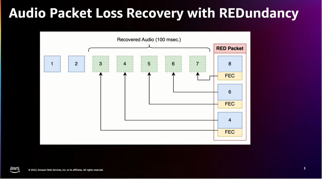 在当前的 WebRTC 中,我们有一种机制来对音频进行冗余编码。如果存在丢包,音频可以通过不同的终端进行重建。这个机制是通过 RTC2198 实现的,我们通过 BRTB 传递冗余的音频数据包,以恢复大约 20 秒的丢失音频间隙。我们根据会话中观察到的丢包情况来调整此过程。随着丢包增加,我们开始发送更多的冗余数据包,并且只在有语音活动时发送冗余数据。这种冗余机制是开发者解决最后一英里和丢包网络问题的传统方式。然而,其中的问题是,如果网络上存在丢包,通常原因是由于无线接入拥塞。如果开始发送冗余数据包,那只会加剧拥塞问题。虽然发送冗余数据包是解决问题最简单的方法,也是目前在 WebRTC 中解决问题的方式,但可能并不是最佳方式,尤其是当涉及到 WiFi 引起的丢包或在移动设备上在不同无线基站之间漫游导致的丢包问题。