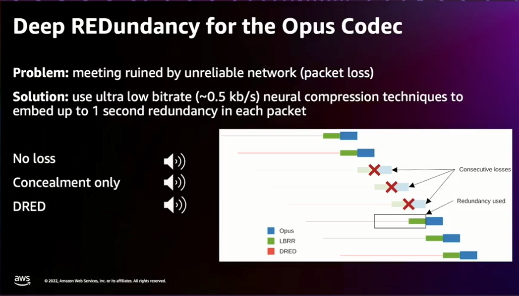 目前的 Opus Codec 支持丢包修复。它有一个机制,在一些音频数据上进行冗余编码,并在数据缺失时尝试重建这些数据。Opus Codec 数据包中还有一小段填充空间,该填充空间实际上可以用来编码底层音频的机器学习构造。然后,我们可以从这些构造中重建可能丢失的音频会话数据包。例如,如果丢失了 500 毫秒的音频数据,每个数据包包含了 1 秒的音频编码,可以用来替换那 500 毫秒的音频数据包。