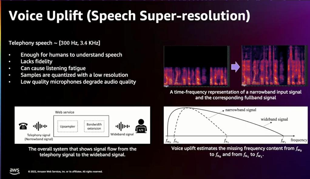 在 Amazon Chime SDK 中,有许多客户使用现有的电信系统,并希望与 SDK 进行集成,通常使用会话初始化协议。他们可能使用 CISCO 呼叫管理器和台式电话环境,并希望以与浏览器端点相同的效率参与音频和视频会话。然而,由于互操作性的需要,这些传统的遗留平台通常只支持 G.711 编解码器,有时可能支持 G.722。但是这些音频的分辨率明显较低,不如基于浏览器的终端所提供的高分辨率音频。为此,我们提供了一种升级机制,可以将源音频的分辨率从8kHz提高到24kHz或48kHz,从而使来自传统电信系统的客户能够以高质量的音频参与实时通信会话,享受高质量的宽带音频体验。