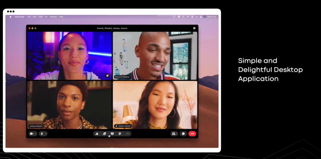传统的RTC是由移动端的一对一和小组通话贡献主要体量。在2022年,我们将通话群组突破到32人。我们对未来的发展持积极态度,我们的技术将在未来支持更大群组的通话。我们还致力于将通话带到移动端之外的设备,我们更新了Messenger在MAc和Windows的桌面app。